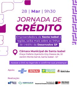 No dia 28 de março, a partir das 9h30, na Câmara Municipal de Santa Isabel, a Desenvolve SP e o Banco do Povo Paulista vão apresentar as linhas de crédito mais atrativas do Estado de SP para Microempreendedores Individuais, micros, pequenos e médios empresários.